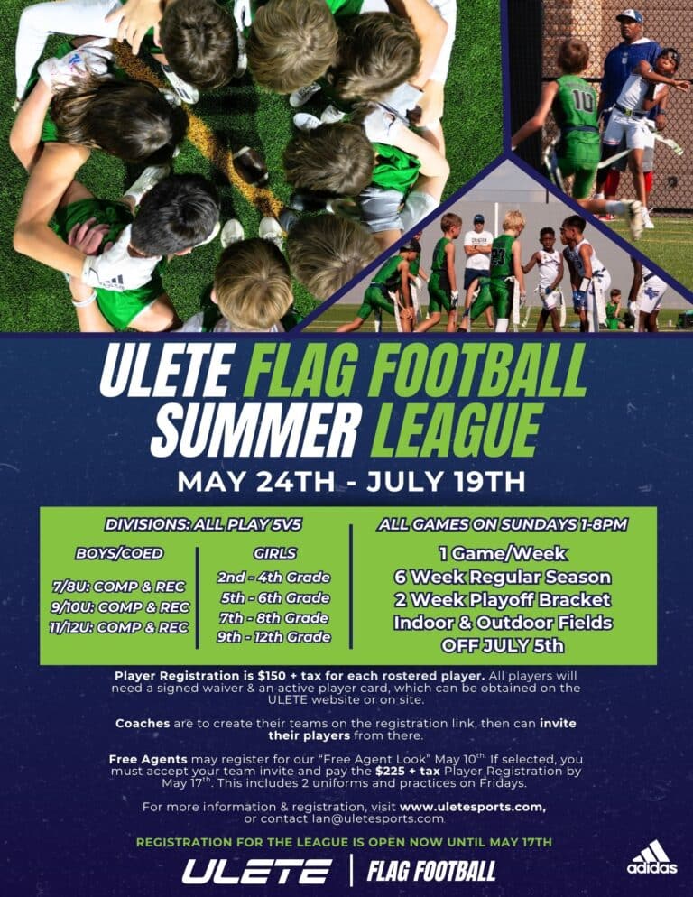 The ULETE Summer Flag Football League 2026 will run from May 24th – July 19th. We will have No Games on July 5th.